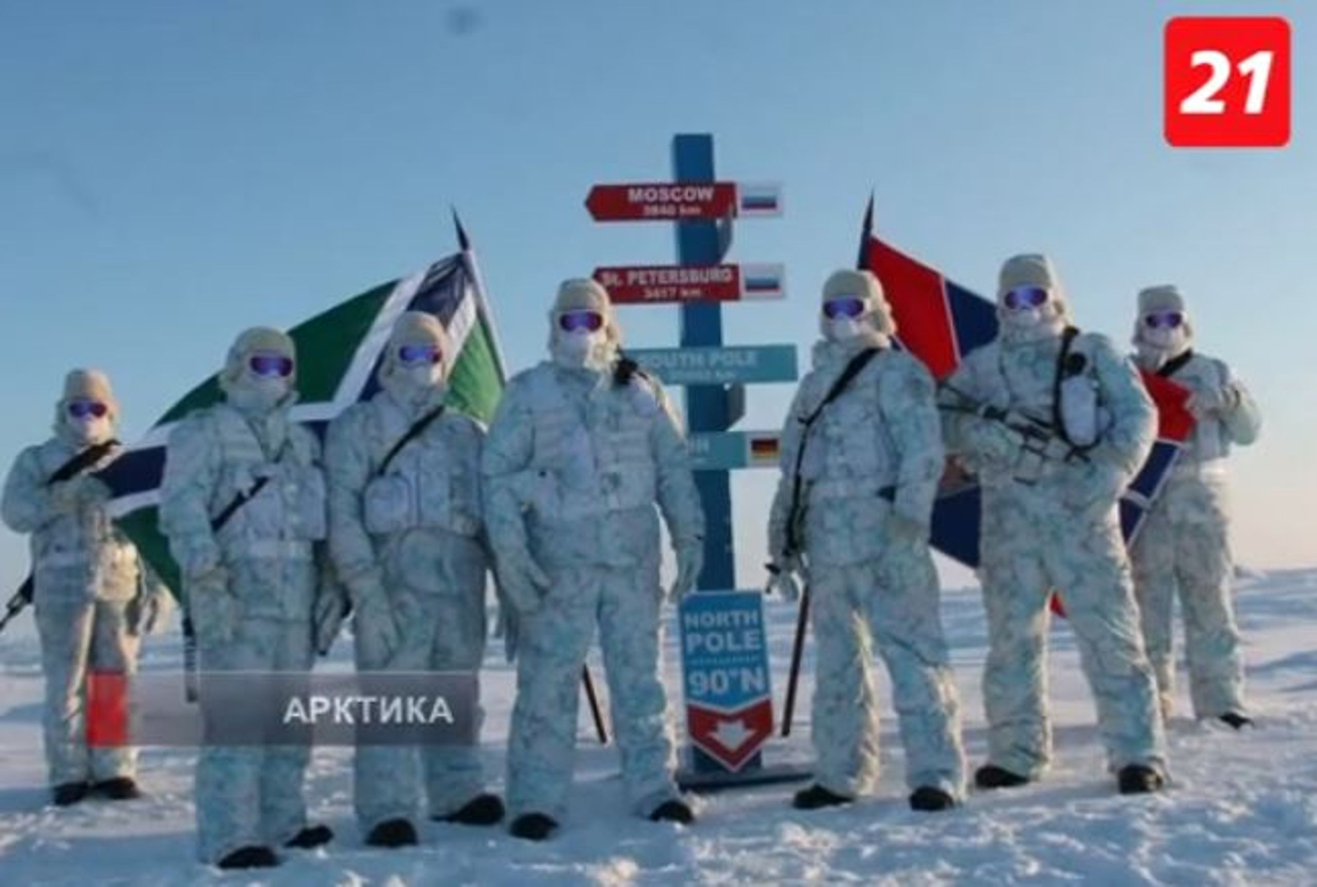 Syv soldater fra Ruslands grænsevagttjeneste FSB nåede i midten af april Nordpolen i fuld kampuniform med automatgeværer. Det viser et tv-indslag fra den russiske tv-station TV21, som mødte soldaterne i Murmansk Lufthavn, da de kom tilbage.