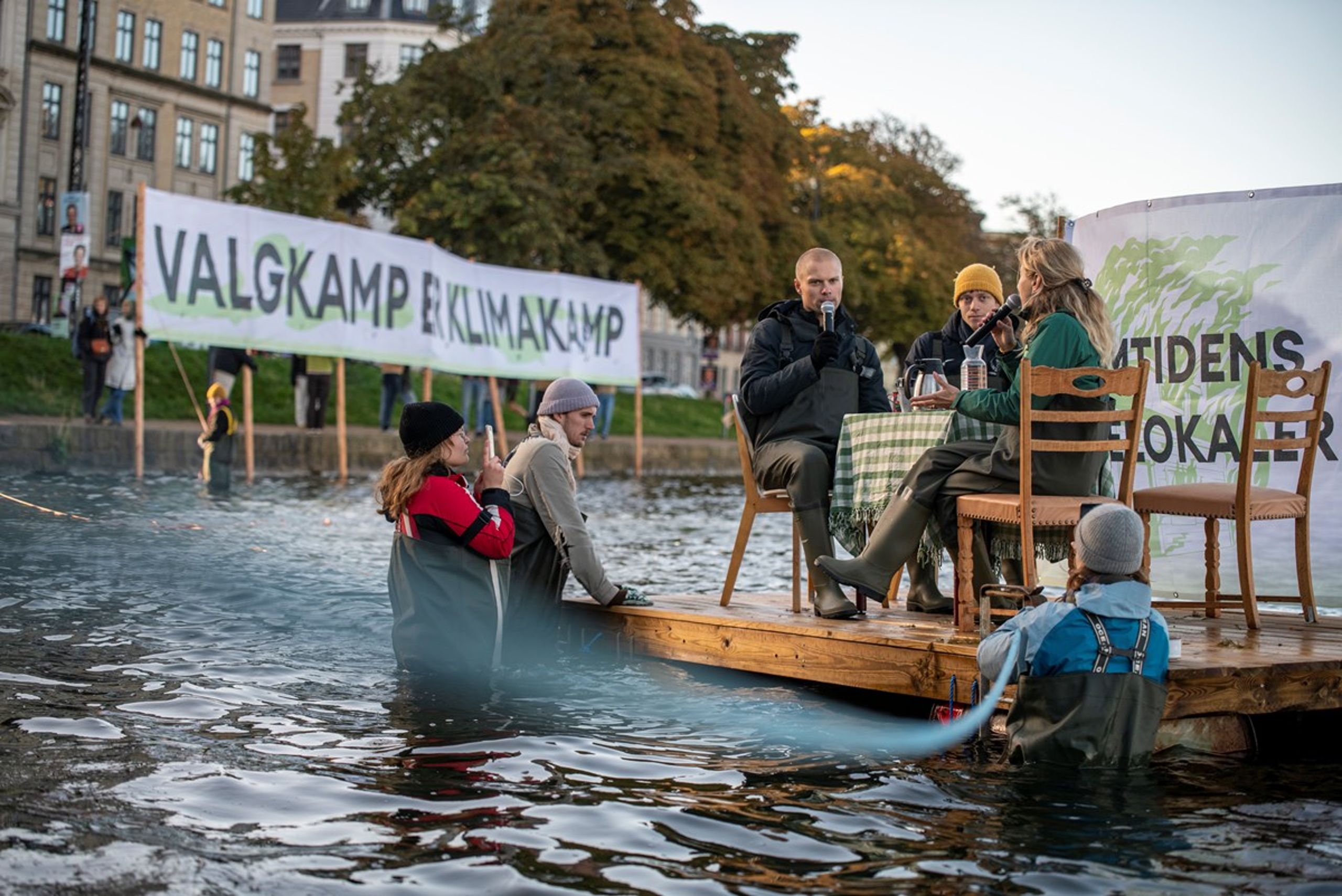 Et massivt banner er spændt op mellem mange unge mennesker ved Peblinge sø. Seks stolper med tovværk bundet fra toppen går ned til personer i vandet med vaders på for at holde det oprejst. ”Valgkamp er klimakamp” står der på banneret, og det kan læses fra den anden side af søen, og kampråbet ”vælg en grøn og retfærdig fremtid” er hyppigt tilbagevende.