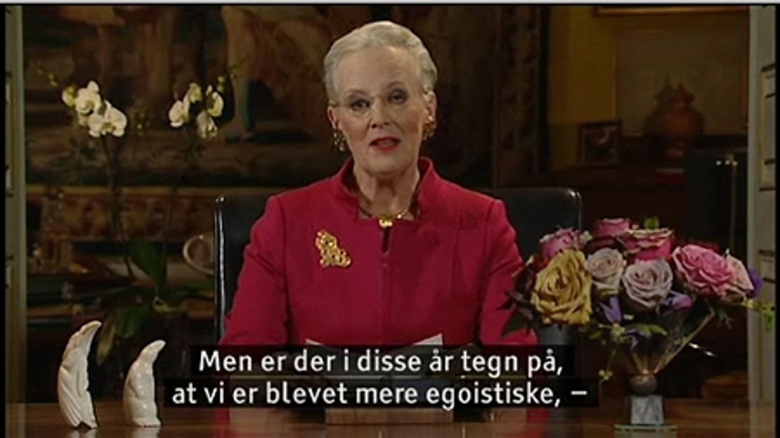 "Men er der i disse år tegn på, at vi er blevet mere egoistiske, at vi er blevet tilbøjelige til først og fremmest at kræve ind og sikre os, at vi hver især får det, vi selv mener at have krav på? Er vi ved at blive mistroiske overfor hinanden og tillægge hinanden mindre pæne motiver," spurgte regenten og svarede umiddelbart i tv-transmissionen til nationen: