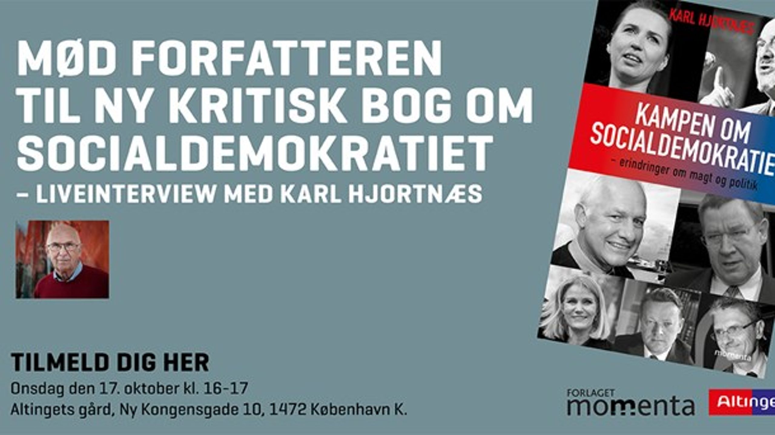 Altinget og forlaget Momenta inviterer til live-interview med Karl Hjortnæs, mangeårig minister og folketingsmedlem for Socialdemokratiet. Det foregår i Altingets overdækkede gård onsdag 17. oktober klokken 16-17 i Ny Kongensgade 10.