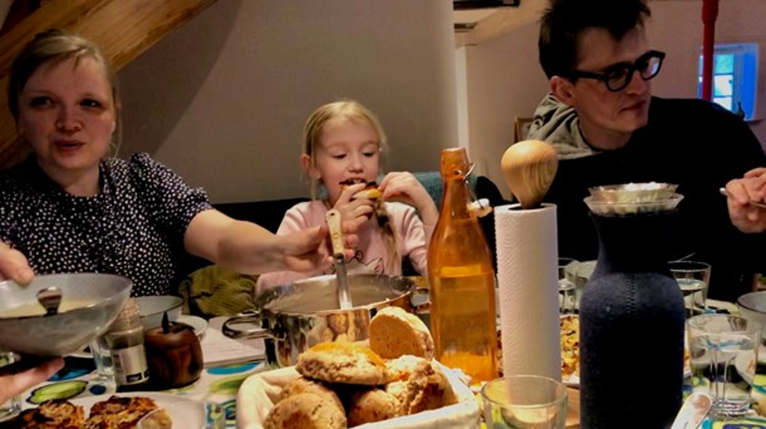 Hans talestrøm bliver afbrudt af det yngste middagsmedlem, der har ladet jordskokkesuppen agere ansigtsmaske, og fokusset bliver for et øjeblik flyttet væk fra alvorssnakken.