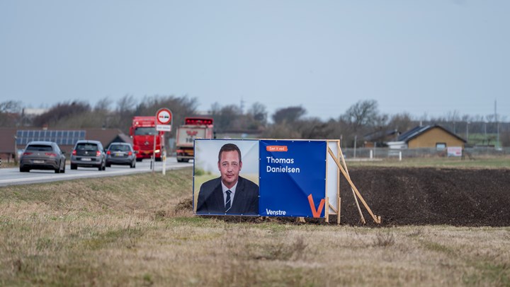 På begge sider af landevejene står store reklamebannere fra Danmarksdemokraterne og Venstre spændt op mellem pæle eller på ballevogne på markerne.