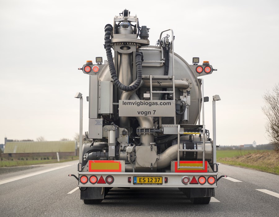 Vi må sænke hastigheden, da vi når op bag en tankvogn fra Lemvig Biogas, indtil den drejer af ved gasanlægget.
