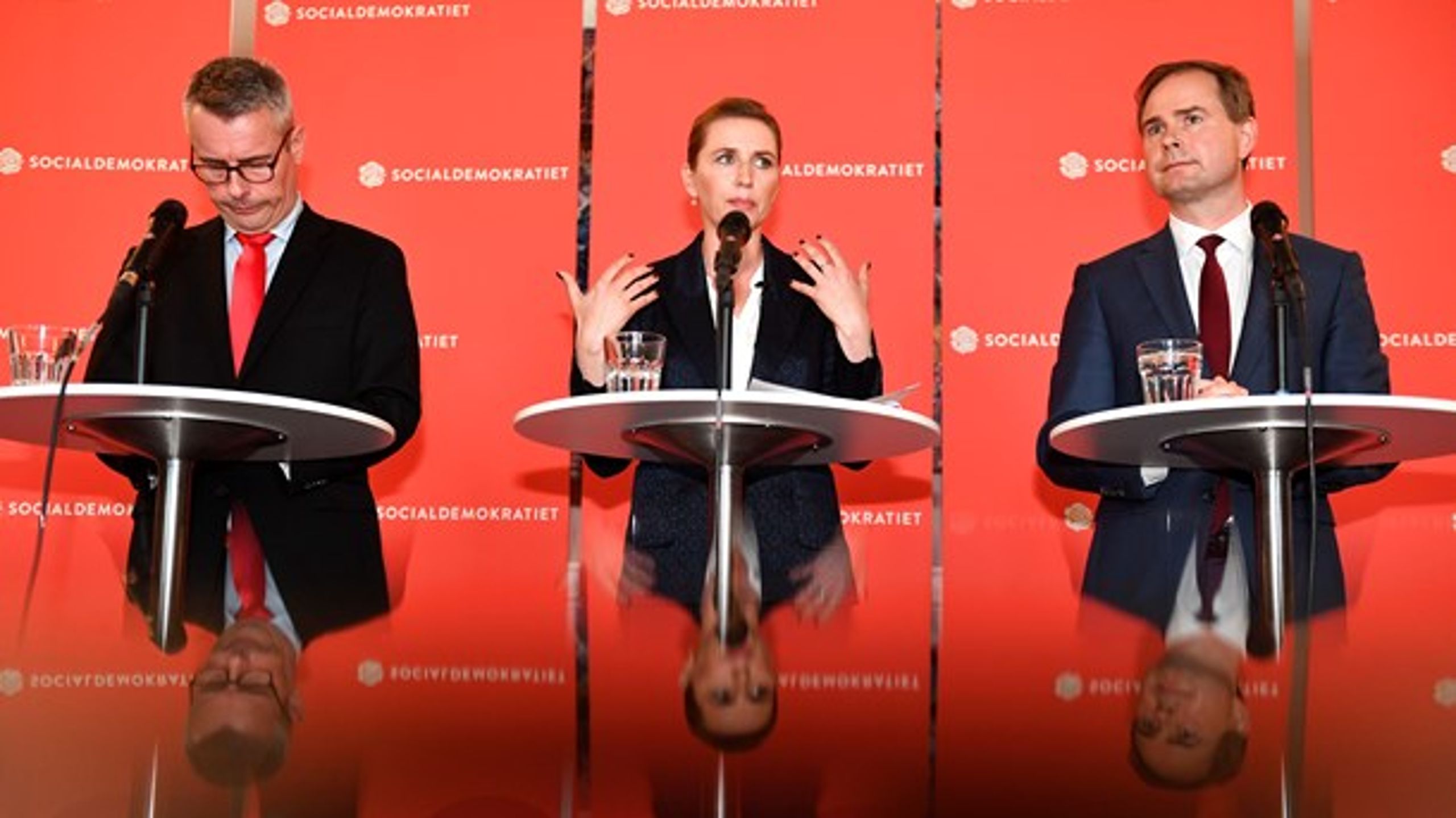 S-formand Mette Frederiksen præsenterede planen flankeret af gruppeformand Henrik Sass (S) og næstformand Nicolai Wammen (S).